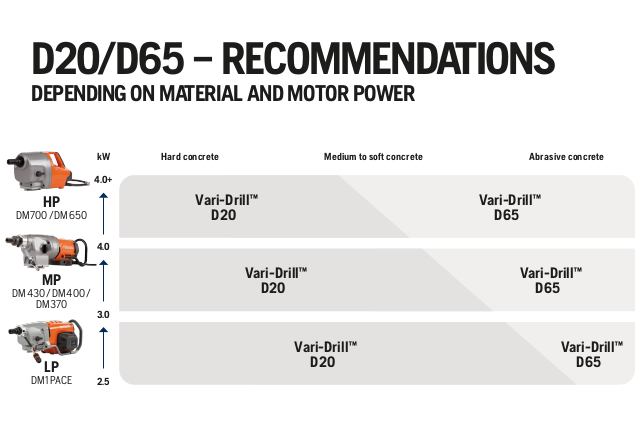 VARI-DRILL™ D20 to wiertło zaprojektowane do pracy w betonach twardych i średnio twardych średnio zbrojonych z wiertnicami o mocy od 2,4 do 6 kW. Może być stosowane do wiercenia w betonie miękkim z zastosowaniem wiertnic z niższego przedziału mocy. Seria VARI-DRILL to optymalny wybór dla profesjonalnych wykonawców szukających optymalnej relacji ceny i szybkości wiercenia przy mniej intensywnych pracach.